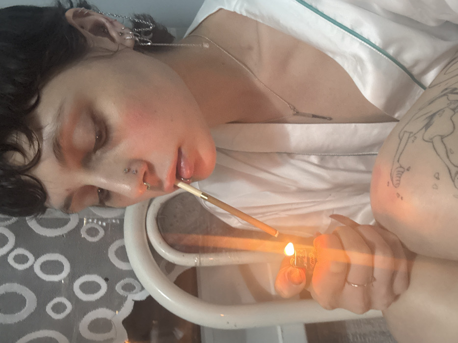 An individual, likely female, with short dark hair and multiple facial and ear piercings, is depicted in a dimly lit indoor setting. She is wearing a white robe with light blue trim and a silver chain necklace with a pendant. Her right hand holds an ignited white Bic lighter, illuminating her face and the cigarette held within a long, slender cigarette holder in her mouth. A tattoo is visible on her right thigh in the lower portion of the frame. In the background, a white chair back is visible, behind which a translucent white curtain or blind with a circular pattern is present. The specific location within the city of Saint Petersburg, Russia, cannot be determined from the image.