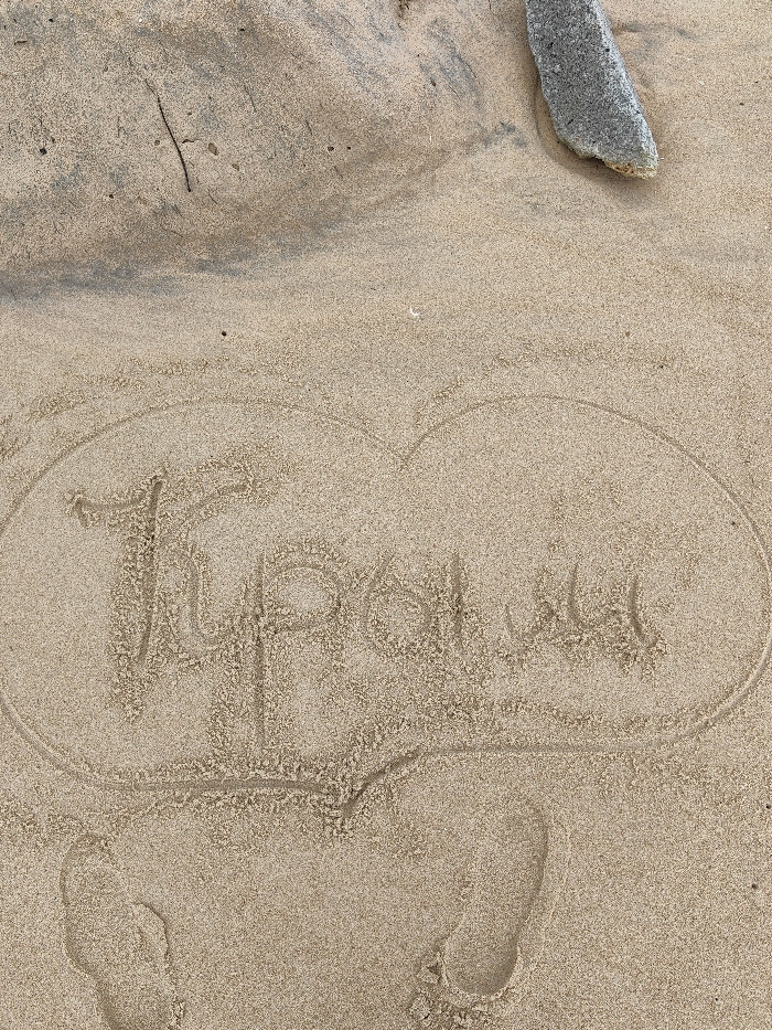 The scene depicts a close-up overhead view of a sandy surface in Thuận An Ward, Vietnam. The primary subject is light tan-colored sand, upon which the Cyrillic word "Тролли" (Trolls) is inscribed within a heart shape. The inscription is centrally located. Below the inscription, two distinct human footprints are visible, suggesting the presence and movement of an individual prior to the image capture. In the upper right quadrant of the image, a grey, irregularly shaped rock is partially embedded in the sand. Scattered across the sand, particularly in the upper left, are small dark specks and thin linear organic debris. The sand exhibits variations in texture and subtle color gradients, indicating minor surface undulations and possibly varying moisture levels. No people are visible in the frame; the only implied human presence is through the sand inscription and footprints.