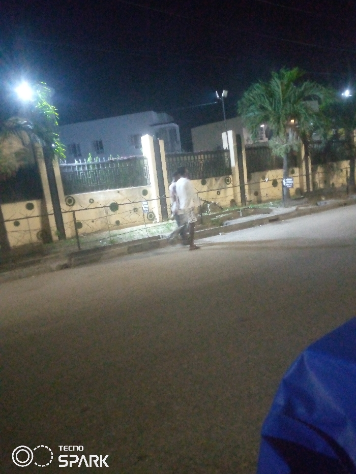 A night scene captures two blurry figures walking along a street next to a fenced property. The fence has decorative circles and possible barbed wire. Buildings can be seen behind the fence, illuminated by streetlights, while palm trees stand tall to the right. The foreground is mostly the street, and a blue object appears in the bottom right. The words "Tecno Spark" are in the bottom left corner.