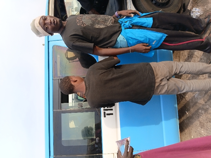 Two men stand beside a blue and white vehicle. The man closest to the camera wears a dark t-shirt and light-colored pants. The other man, in the foreground, has a light-colored head wrap, a dark t-shirt, black pants with a red stripe, and a blue jacket tied around his waist. Part of a wheel is visible at the top of the picture. Someone wearing a red dress appears to be holding a packet.