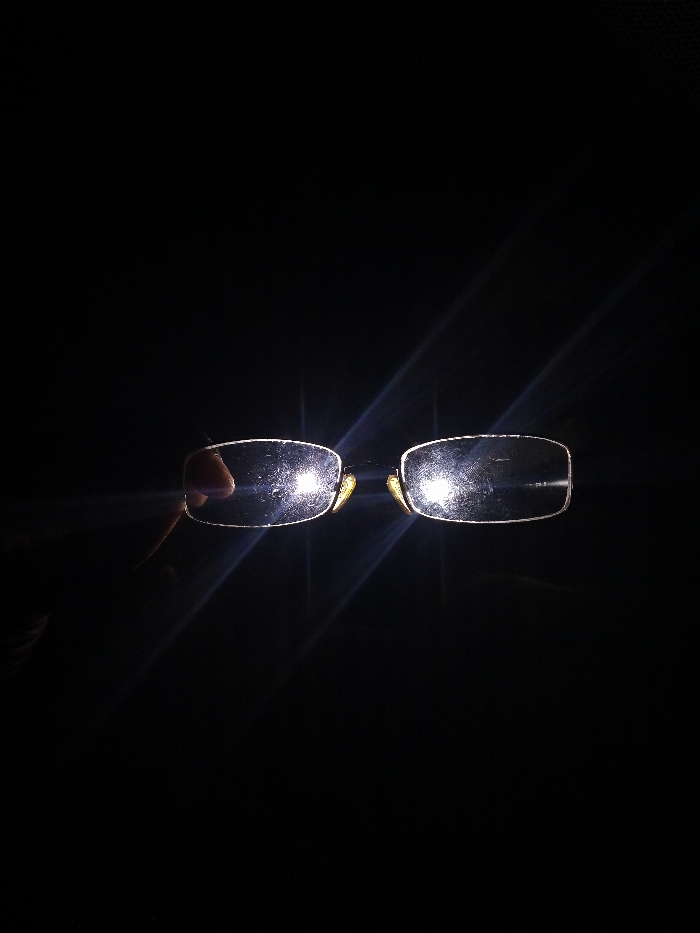 A pair of glasses is held in the dark, illuminated by a light source. The frames appear to be silver or light metal, and the lenses are rectangular with rounded corners. The light creates bright reflections and streaks across the lenses, highlighting dust or smudges. A finger is visible holding the left side of the glasses. The background is completely black, focusing all attention on the eyeglasses.