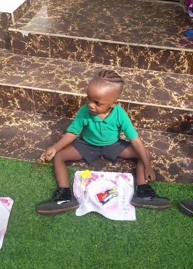 Here's a detailed description of the video: A young child is sitting on the ground, on a patch of artificial grass in front of a set of tiled steps. The child is wearing a green polo shirt, dark shorts, and oversized black shoes. They have neatly braided hair. A gift bag is placed between their legs on the grass. A lollipop and other small items are visible within the gift bag. The steps behind the child are decorated with brown and beige tiles. The child moves their hands, gestures to the side, and scratches their head.