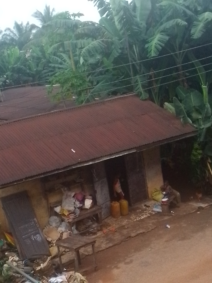 This image depicts an elevated view of a single-story structure with a weathered, reddish-brown corrugated metal roof, situated in the City of Unknown, Unknown. The structure's walls are light brown/tan. Two open entryways or stalls are visible on its facade. Behind and to the right of the building, dense tropical vegetation, primarily large-leafed plants consistent with banana trees, dominates the background. Multiple utility lines stretch horizontally across the upper mid-ground. In the immediate left foreground, a pile of mixed refuse, including plastic bags, paper, and other debris, is accumulated. A dark wooden door leans vertically into this pile, partially obscuring a section of white PVC pipe. Near the left doorway, a light-colored wooden table is positioned, behind which a larger wooden structure holds various items such as bags and fabric. A smaller, low, square wooden table is angled in the center foreground. Inside the right entryway, two yellow plastic jerrycans are visible. To the right of the structure, an individual is seated on a low object, facing left. This person wears dark clothing and appears to be occupied with a white container or item on a low surface in front of them. A discarded white plastic cup lies on the ground nearby. A small, indistinct animal is partially visible near the far right edge of the frame, behind the seated person. A single white cylindrical object rests on the main corrugated roof. No direct human interactions are observable. The ground in the foreground is unpaved, consisting of reddish-brown compacted earth.