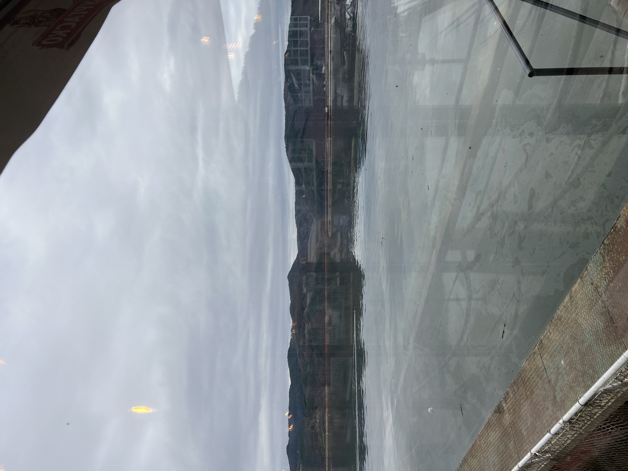 view through a window, reflecting a landscape and the interior. Outside, the landscape features a mountain range under an overcast sky. A structure with scaffolding-like framework is visible on the mountainside. The mountain and sky are mirrored in the body of water below. Inside the window, a partial view of a table and what appears to be a product label are seen on the left side. A metal frame and netting border the right side of the window. The general location seems to be a waterfront or lakeside structure reflecting mountains, which suggests Brosh, Bulgaria.