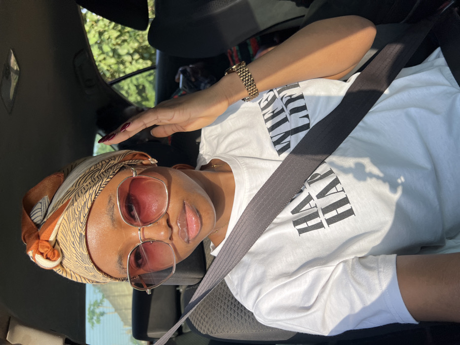 A woman wearing a patterned headscarf and rose-tinted glasses is seated in a car, wearing a white t-shirt with the text "HAPI WIFE LIFE" in black letters. A grey seatbelt crosses her body. She is wearing a gold watch on her left wrist and has long, dark red manicured nails. The car interior is visible, including the seat and a glimpse of the outside through the window. Sunlight illuminates the scene.