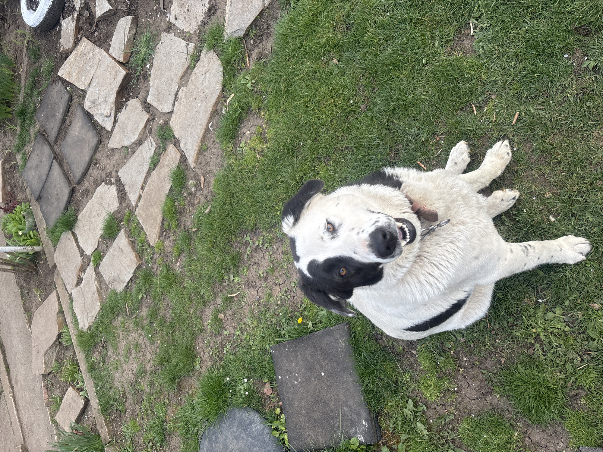 A dog is lying on the grass in a garden setting. The dog is primarily white with black markings on its head and body. It is facing the camera and its mouth is slightly open, revealing its teeth. Behind the dog, there is a path made of irregular stone slabs. The ground is a mix of grass, soil, and some bare patches. The location is the city of Dolna Dikanya, Bulgaria.