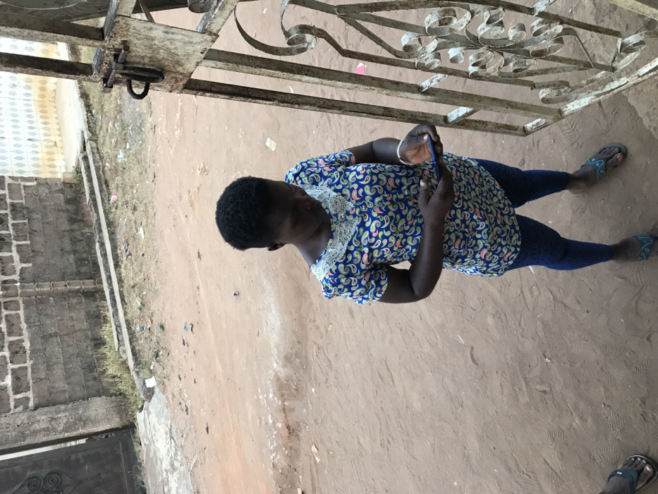 A woman in a blue paisley blouse and blue leggings stands on a sandy ground looking at a smartphone. She wears blue sandals and a white bracelet. An ornate metal gate sits above her, while a brick wall and some sparse vegetation border the sandy ground in the background. The photo appears to be taken from above, looking down on the scene.