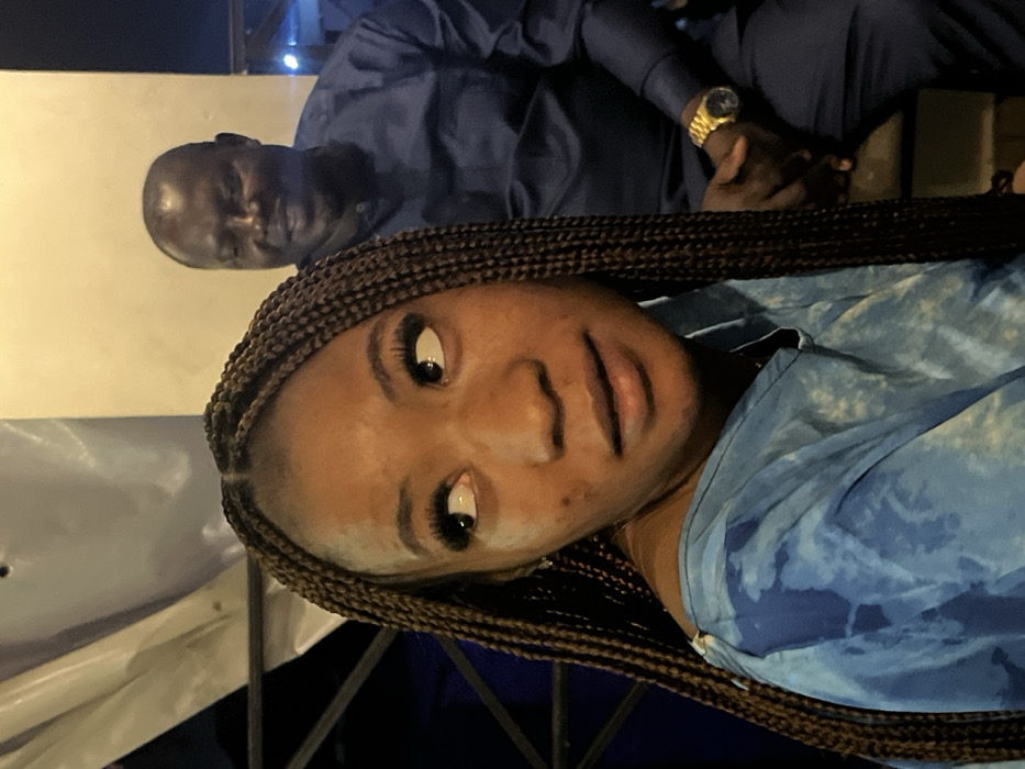 A young woman with braided hair is facing the camera, wearing a blue tie-dye shirt