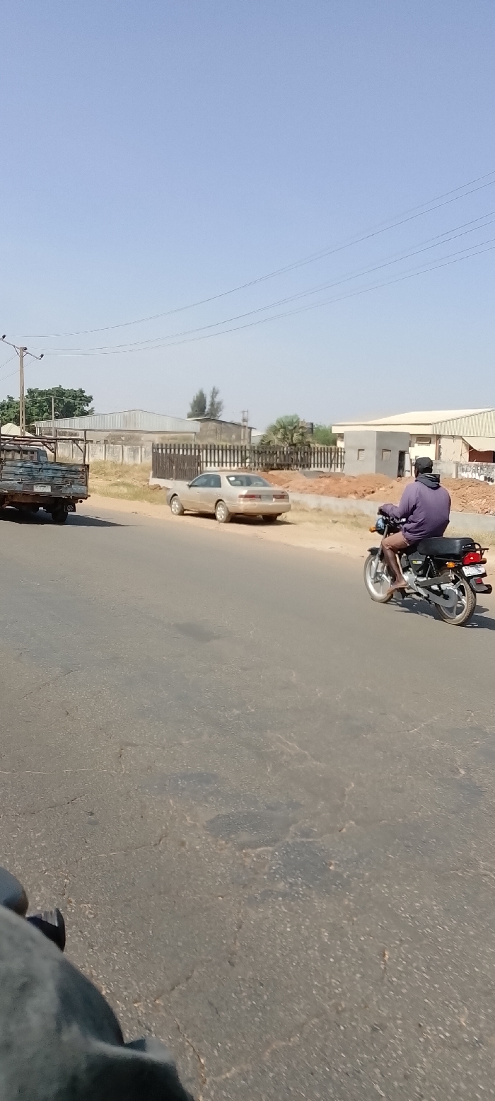 The image displays a daytime street scene in Kakuri Gwari, Nigeria, under a clear, light blue sky with visible overhead power lines. The asphalt road surface shows signs of wear, including cracks and patches. In the left foreground, the rear section of a dark-colored flatbed truck is partially visible, facing away from the viewer. On the right side of the road, a male individual operates a black motorcycle, traveling away from the viewer. The rider is wearing a dark purple long-sleeved shirt, light-colored shorts, and a dark head covering; his feet are bare. To the right of the road, a light-colored sedan (resembling an older model Toyota Camry) is parked on a dirt shoulder, facing away. Behind the parked vehicle, a dark wooden fence runs along a dirt embankment with sparse vegetation. In the background, multiple structures are visible. To the left, green trees and utility poles are present. Further back, several industrial-style buildings with light-colored, possibly corrugated metal roofs are situated. To the right, a newer building with a grey lower section and a light upper section stands amidst disturbed earth, indicating possible construction or recent development. The general environment suggests a mix of urban and industrial characteristics.
