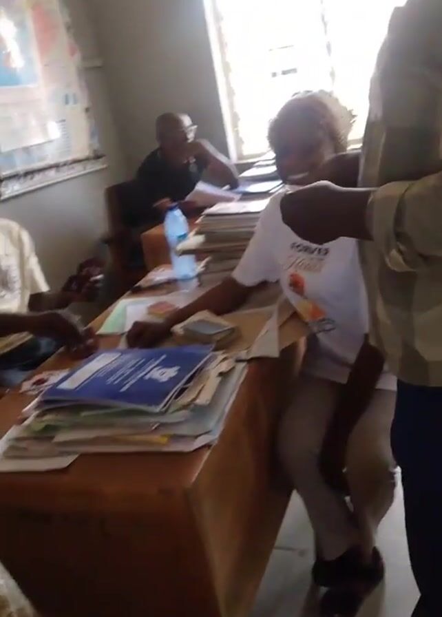 A group of four people are gathered around two adjacent wooden desks. The desks are covered with stacks of papers and notebooks. A window is visible in the background, and a poster hangs on the wall. One woman is wearing a white shirt with "Forever" printed on it. One man is holding and manipulating cards. The people seem to be involved in an activity that could involve paperwork or a game. The environment appears to be an office or classroom.