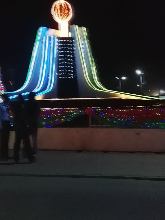 A blurred image showcases a large, illuminated structure at night. The structure features a central tower with a circular top, flanked by cascading blue and green lights. Below, a wall adorned with multicolored lights is visible. Three people are standing in the foreground, silhouetted against the bright lights behind them. Street lamps are visible in the background. The overall impression is that of a celebratory, illuminated display at night.