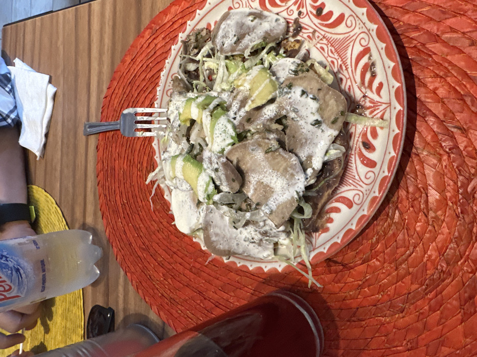 A plate of food, possibly beef tongue salad, sits on a colorful placemat. The salad includes slices of meat, avocado, and white sauce with herbs. A fork rests on the plate. A wooden table is visible to the side, along with a water bottle and a red container or can. A person's arm and hand holding the bottle are also visible. The placement setting suggests a meal in progress.