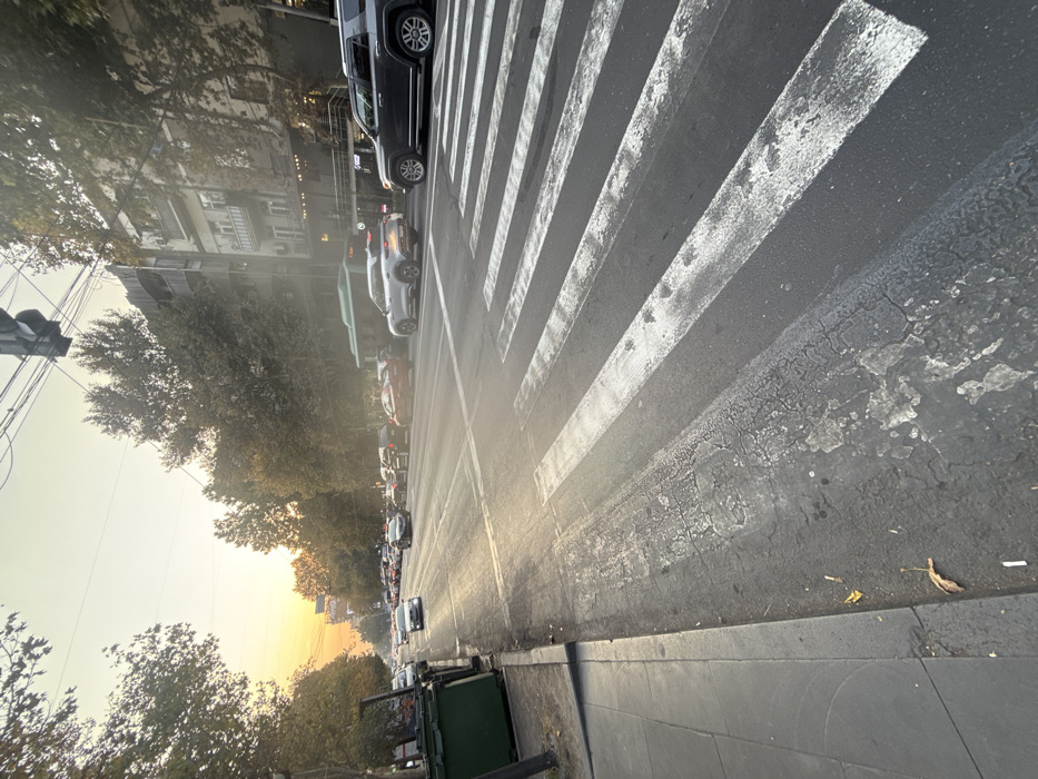 The image depicts a street-level view of a multi-lane urban street in Yerevan, Armenia, during what appears to be late afternoon or early evening. The sun, a warm orange-yellow hue, is low on the horizon, casting long shadows and a strong golden light across the scene, particularly reflecting off the asphalt road surface. In the immediate foreground, a grey concrete sidewalk runs along the left edge. Adjacent to the sidewalk, two dark green, rectangular industrial waste bins are visible. The asphalt road surface begins directly next to the sidewalk, transitioning into a pedestrian crosswalk marked by six visible, worn white stripes, some showing significant fading and cracking. The asphalt in the first lane, near the sidewalk, exhibits extensive cracking and wear. Scattered brown leaves and several cigarette butts are present on the worn asphalt and sidewalk near the bins. The midground features a dense line of vehicular traffic occupying multiple lanes, moving away from the viewer. Vehicles appear stationary or slow-moving. On the right side, a dark grey SUV, possibly a Toyota 4Runner, is positioned in the foreground of the traffic, followed by a lighter-colored SUV (potentially a Nissan Juke). Behind these, a green city bus is visible. Further down the street, various other cars (sedans, SUVs) are queued. The background consists of multi-story residential and commercial buildings lining both sides of the street, partially obscured by a dense canopy of deciduous trees with green and yellowish foliage. The buildings on the right feature balconies and dark-framed windows. Above the tree line, the sky transitions from a bright golden-orange on the left to a hazy pale yellow further right. Overhead, dark power lines and a traffic light fixture are visible. No individual people are distinctly visible in the scene.