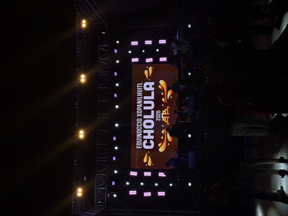 The image depicts an outdoor night event in Cholula, Mexico, identified by the large LED screen displaying "EQUINOCCIO XOPANILHUITL CHOLULA 2026