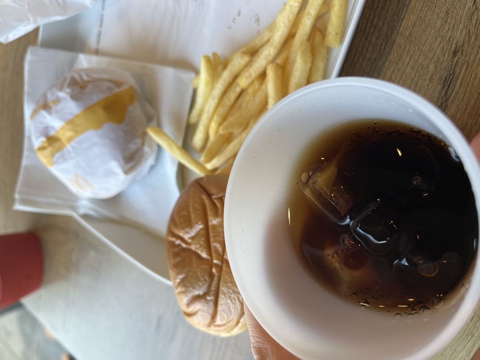 - "The image captures a close-up, first-person perspective of a fast-food meal displayed on a light brown wooden surface, characteristic of a dining establishment in the city of Unknown, Unknown" by FM-W2ag82, licensed under CC BY 4.0