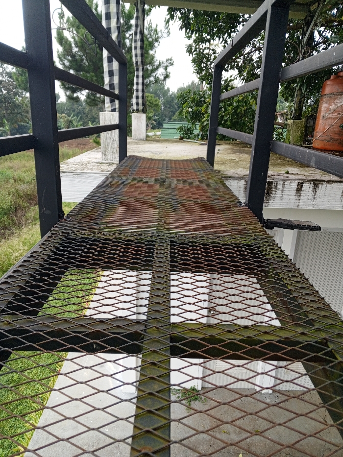 An elevated metal grate walkway spans between structures. The grate is dark and corroded in places, offering a view to the ground below. Black metal railings run along both sides of the walkway. In the distance, checkered cloth is draped on vertical supports. Lush greenery surrounds the walkway, with trees and vegetation visible on either side. A brown water tank sits to the right.