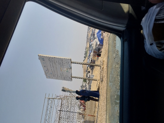 The scene, located in Deir el-Balah, Palestinian Territory, is captured from within a vehicle, showing a dark dashboard and a white plastic bag with contents in the lower right foreground. Directly outside the vehicle, an unpaved road surface displays patches of standing water or mud. Two individuals stand on the sandy ground to the left of center: one in dark clothing, the other in a long dark blue garment with a dark head covering, both facing generally towards the right. To their right, a large white rectangular sign, mounted on two poles and slightly tilted, displays text primarily in Arabic, with the word "Sis" or "Six" visible in English script at the top right. In the background to the far left, a metal skeletal structure, resembling scaffolding or an incomplete building frame, is present above a concrete barrier. To the right of this, a sprawling, dense temporary settlement consisting of numerous tents, predominantly white, with at least one prominent blue tarp tent, extends across a sandy, undulating landscape under a clear, light blue sky. The overall environment is arid and marked by temporary structures.