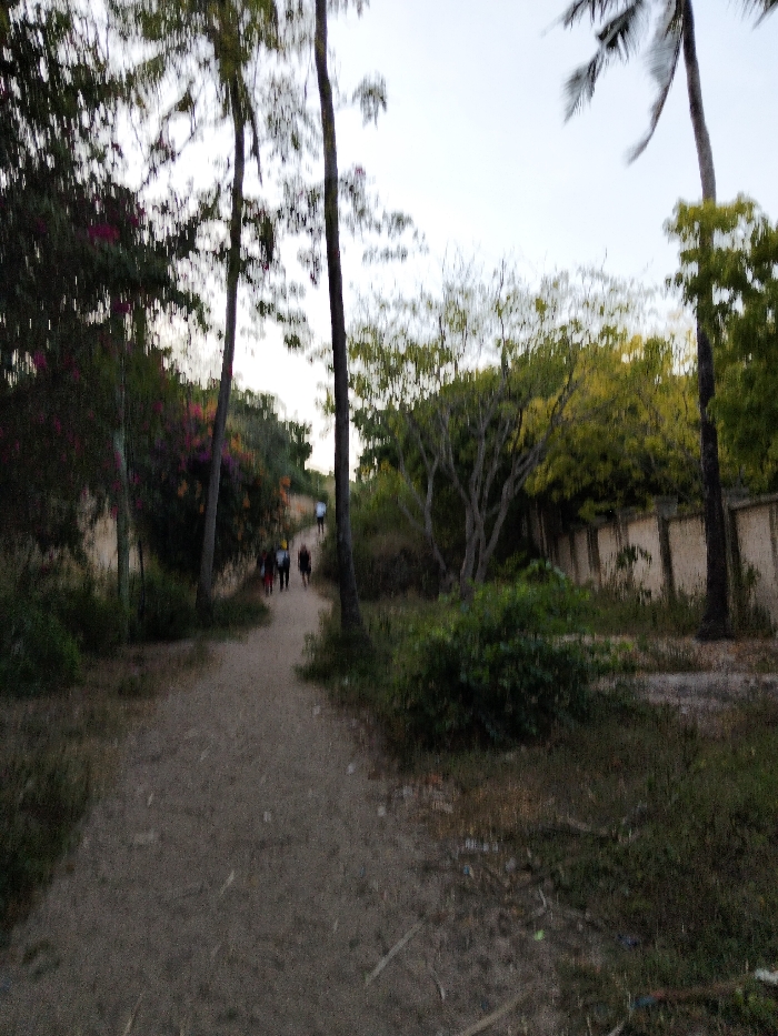 The scene depicts an unpaved dirt path in Gombato Bongwe ward, Kenya