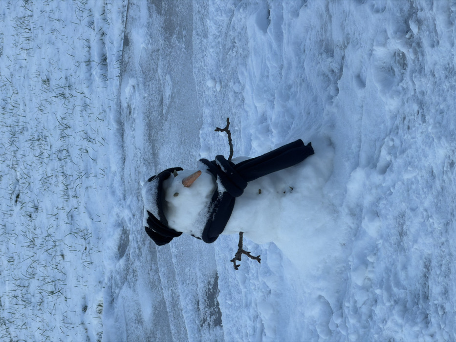 A snowman stands centered in a snow-covered outdoor environment in Pétange, Luxembourg