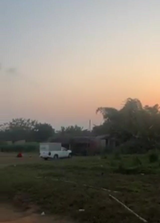 volleyball game being played on a dirt field at dusk. The sun is setting, creating a colorful sky. A white truck is parked on the side of the field near a few small buildings. Some people are sitting near the edge of the field, watching the game. There are trees surrounding the field.
