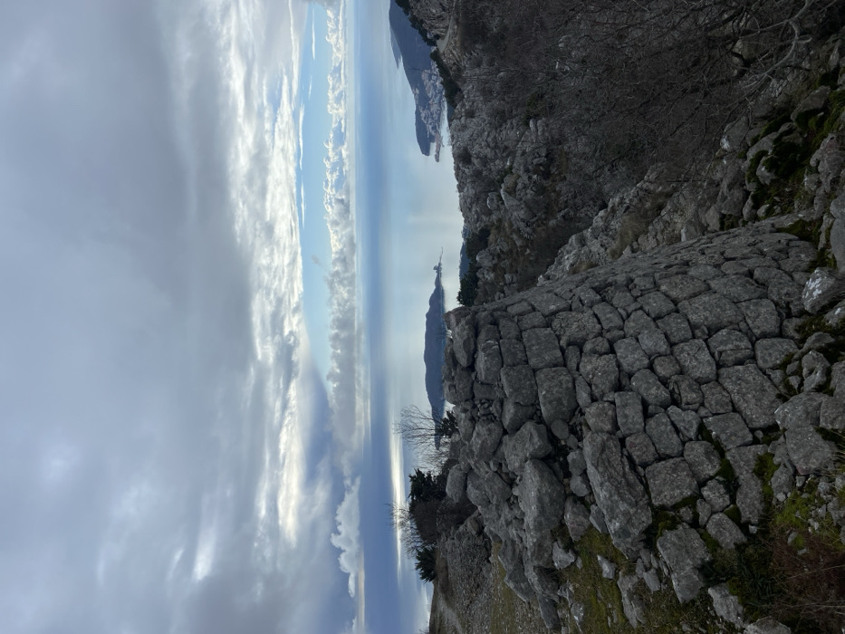 The image depicts an elevated panoramic landscape in Brajici, Montenegro, overlooking the Adriatic Sea and coastline. The foreground features a curved stone wall remnant constructed from grey, rough-hewn blocks, partially covered with sparse green moss and surrounded by jagged rocks. To the left, a narrow dirt path is visible on a rocky slope with scattered dry vegetation. The midground slopes descend, revealing more rocky terrain and leafless deciduous trees. In the background, the calm, light-blue Adriatic Sea dominates, reflecting a partially overcast sky. A distinct island or peninsula with structures is situated in the sea towards the left, while a densely built coastal town, consistent with Budva, occupies the right side of a bay. The sky is characterized by a mix of dark grey stratocumulus clouds and breaks revealing brighter blue sky with white cumulus clouds. No individuals are present in the scene.