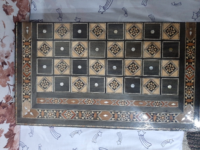 - "The image displays a rectangular wooden board, intricately detailed with marquetry and mother-of-pearl inlay, viewed from an overhead perspective" by FM-NpFIv2, licensed under CC BY 4.0