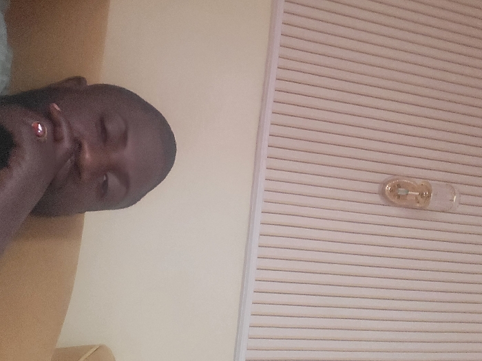 The image depicts an indoor scene in the city of Babawa, Nigeria. A dark-skinned male subject, visible from the nose upward, occupies the lower half of the frame. He has short hair and appears to be resting his chin on his right hand, which displays a reddish-brown ring on the ring finger. His eyes are partially closed. The subject is seated on a light brown or tan upholstered surface, possibly a sofa or armchair. The background consists of a plain light beige wall. Above the wall, a white panel with vertical striations extends across the upper portion of the frame. Mounted on this white panel, slightly right of center, is a transparent, capsule-shaped decorative object containing a golden interior and a central element.