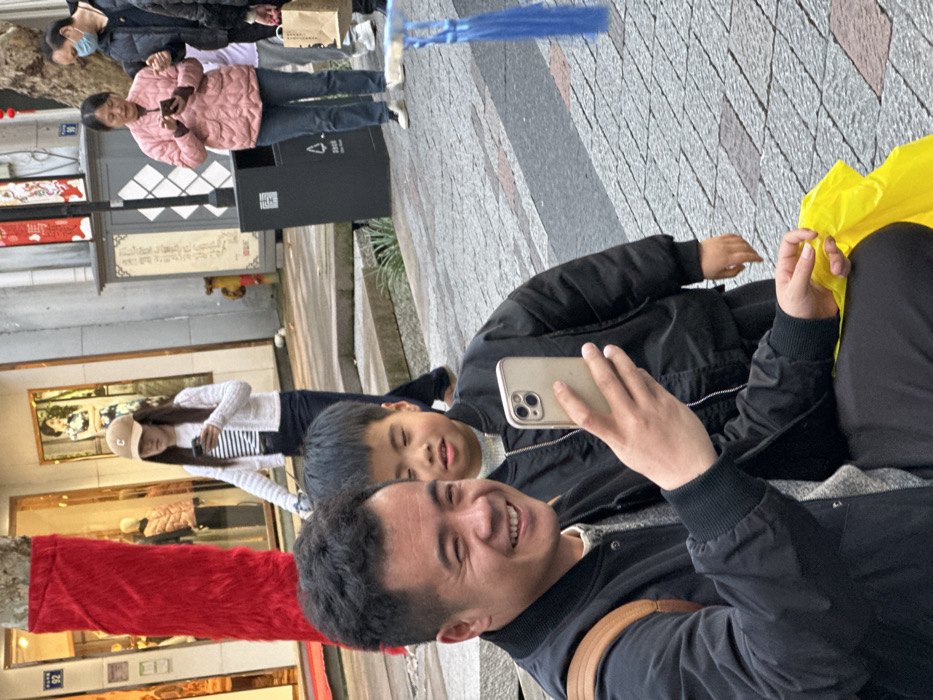 A daylight street scene in Shangcheng District, China, captures multiple individuals on a paved pedestrian walkway lined with commercial establishments. In the immediate foreground, a smiling man of East Asian descent, approximately 30-45 years old, with short black hair, is shown from the chest up, looking directly towards the viewer. He wears a black bomber jacket over a grey speckled sweater and dark trousers. A brown leather shoulder strap is visible on his right shoulder. He holds a light gold smartphone with a multi-lens camera array in his right hand, positioned as if capturing a photo or video. His left hand loosely holds a crumpled yellow object. Standing slightly behind and to the right of the man is a boy of East Asian descent, approximately 5-8 years old, wearing a black bomber jacket. The boy's eyes are partially closed, and he looks slightly to his right. In the background, a bustling urban environment unfolds. On the far left, a tree trunk wrapped in red textured fabric stands beside a storefront featuring large glass display windows with mannequins and golden interior lighting. A young woman of East Asian descent, with long dark hair, wearing a beige baseball cap with a 'C' logo, a white patterned cardigan, a black and white striped top, and dark jeans, walks leftward, focused on a black smartphone held in both hands. To her right, a black public waste bin is visible. Further right, an older woman of East Asian descent, dressed in a pink quilted jacket and blue jeans, stands while looking down at a black smartphone. Partially obscured next to her is a man of East Asian descent, wearing a dark puffer jacket and a light blue surgical mask, holding a paper shopping bag. A blurred blue object with tassels is visible on the far right edge of the frame. The ground is paved with interlocking grey and dark grey rectangular bricks. Building facades featuring traditional Chinese architectural elements, red banners with Chinese characters, and a yellow fire hydrant are discernible in the mid-ground.
