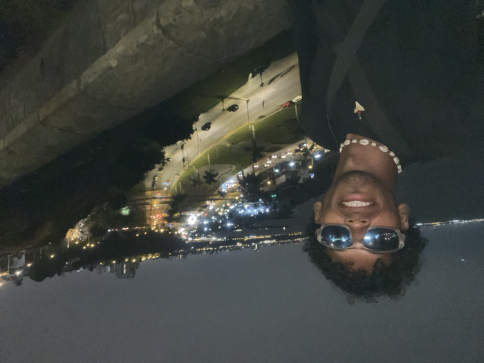 A person with curly hair and sunglasses smiles at the camera, wearing a shell necklace and a dark jacket. The background features a nighttime city scene with bright lights, a road with cars, and a body of water. A stone structure is visible above and to the left. The entire image appears to be rotated.
