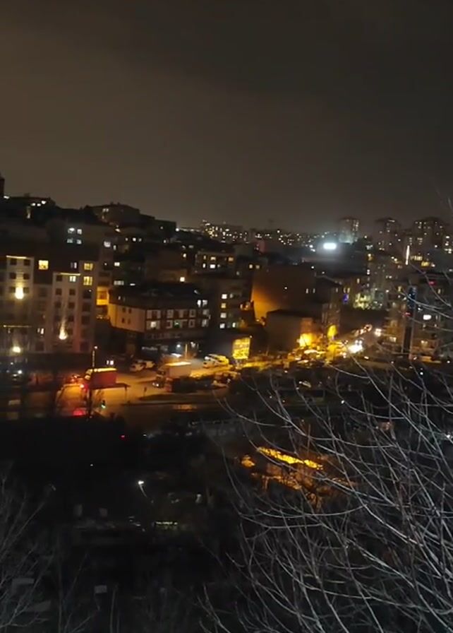 cityscape at night. Buildings with lighted windows dot a slightly hilly terrain, with a dark sky above. Bare tree branches are visible in the foreground. Cars move along streets, their headlights creating streaks of light.