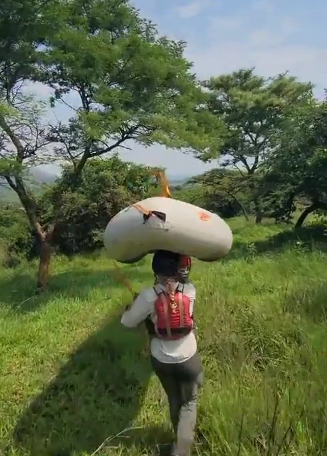 A person, from the lower back, is walking in an open grassy field with a large deflated white inflatable boat on their head. Another person is walking a few steps in front of them. Both are walking on a path through the grass, which is dotted with trees. The sky is blue with some scattered clouds.