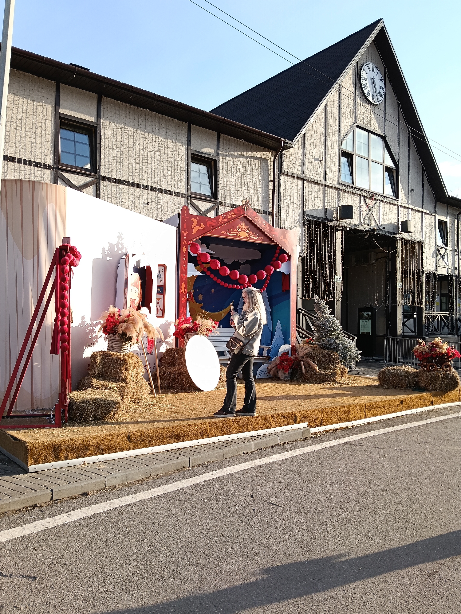 An outdoor scene in Odintsovo, Russia, features a festive decorative display positioned on a raised platform alongside an asphalt road. In the background, a two-story building with a light-colored textured facade and dark brown timber-like accents (fachwerk style) serves as the backdrop. The right side of the building features a prominent gabled roof with a large circular clock displaying Roman numerals and a triangular window below it. An entrance on the building's right is adorned with vertical string lights, and two air conditioning units are mounted above it. The raised platform, covered in a light brown material resembling straw or hay, extends across the midground. It is bordered by a white strip. Numerous bales of hay are arranged on this platform. The display includes a white vertical panel with cut-out shapes on the left, alongside a red post decorated with red spheres. Centrally, a red, ornate archway acts as a focal point, featuring a blue interior backdrop with a crescent moon, stars, and hanging red spheres. Various baskets filled with red flowers and tall, feathery dried plants are placed on the hay bales. A large white circular disc leans against a hay bale near the center. To the right, two artificial evergreen trees, dusted with white to simulate snow, and a small, decorated, carriage-like object are also present on the platform. A single blonde female, wearing a light-colored jacket, dark trousers, and dark shoes, stands on the platform, holding a smartphone with both hands and looking down at it. She carries a dark shoulder bag. The scene is under a clear blue sky, illuminated by bright sunlight which casts distinct shadows to the right, indicating a late morning or afternoon time. The foreground consists of an asphalt road with a white solid line, bordered by a grey paver-stone curb adjacent to the platform. A utility pole and overhead wires are visible on the far left.