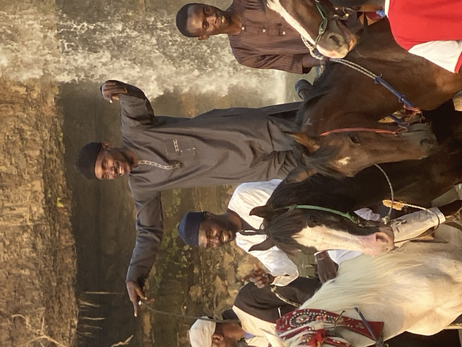 A group of men are riding horses in front of a waterfall. One man is wearing a gray robe and a black cap, smiling and pointing towards the waterfall. Another man is wearing a brown shirt and standing behind a horse. Another man is wearing a white shirt and a blue cap. The horses are brown and white. The scene appears to be a celebration or event.