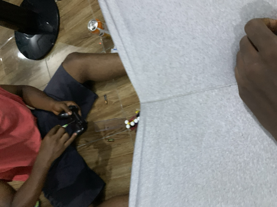 A person wearing a red shirt and blue shorts is sitting on a wooden floor, working on a device with a green wire attached. The person is wearing a wristwatch and holding the device with their left hand. Their right hand is holding a small object. The person is seated on a wooden floor. The person's right leg is extended and the left leg is bent. The person is sitting in a room with a grey sofa, and a black lamp base can be seen in the background. There is an orange can lying on the floor, and an empty glass of water. The location is a room in Umuola, Nigeria, with coordinates 4.89 latitude and 7.014 longitude. A dark brown hand is partially visible in the bottom right corner of the image.