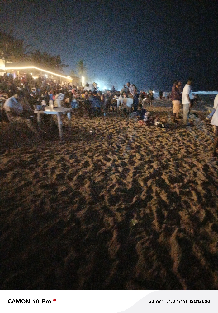 A beach at night is bustling with people gathered around tables under string lights. Individuals stand and sit, creating a lively scene near the water's edge. The sand, textured by footprints and shadows, dominates the foreground. The camera is slightly blurry. The image has poor visibility due to low light.