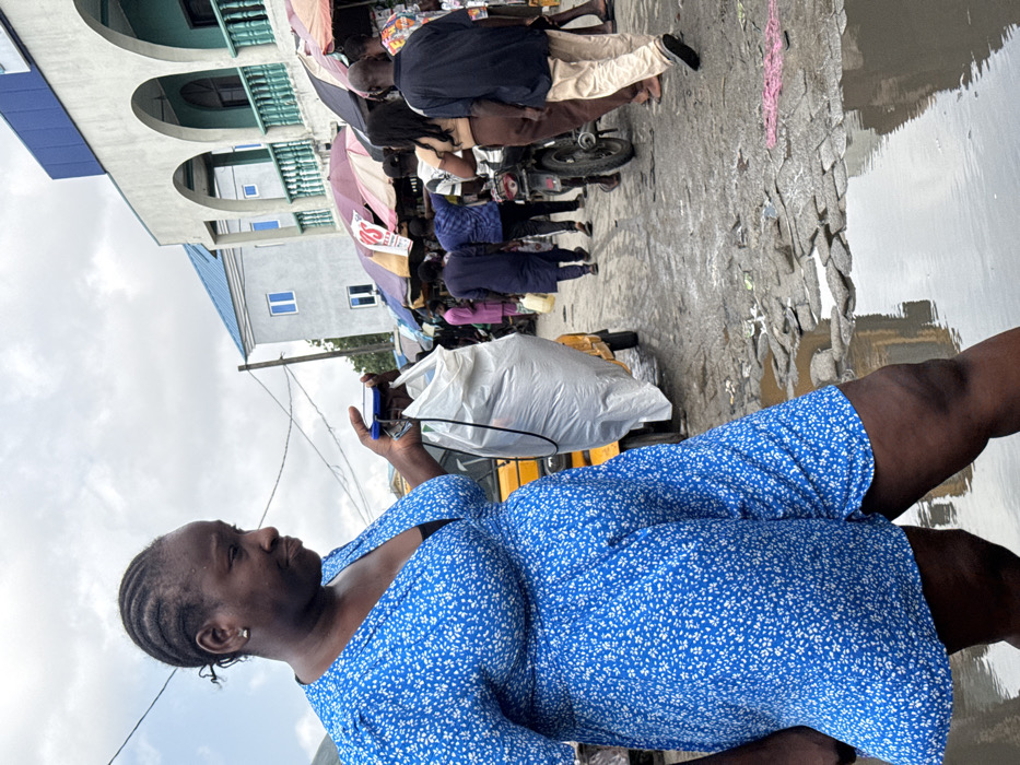 The image depicts a bustling urban market scene under an overcast sky in Lagos, Nigeria. In the immediate foreground, an African woman of medium build, with dark skin and braided hair, stands partially facing the camera while looking to her right. She wears a short-sleeved blue dress with a white floral pattern and a V-neckline; the dress drapes over a prominent belly. In her left hand, she holds a blue smartphone with a white plastic bag containing items hanging from it by a black cord. Behind her, a yellow motorized tricycle (keke napep) is partially visible, facing away from the camera, with a large white bag on its rear. The midground features numerous pedestrians moving through the market. Several market stalls or vendor setups are visible, characterized by colorful striped umbrellas in shades of red and orange, and an awning with a red sign partially displaying "O'S". To the right, people in various attire are seen, including a man in a dark blue traditional garment, another in a dark t-shirt and light trousers, and a woman in a light brown top. A motorcycle is partially visible behind the pedestrians on the right. In the background, multiple buildings are present. On the far right, a two-story building features a light-colored facade with green arched balconies on the upper floor, topped by a blue roof structure. To its left, a grey building with blue window frames and a blue roof is visible. The ground is an uneven, dark, paved surface with multiple large puddles reflecting the sky, indicating recent rain or poor drainage. Overhead power lines are visible against the cloudy sky.