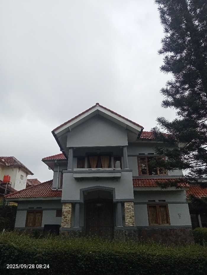 The image depicts a two-story residential building located in Waso ward, Kenya, under an overcast sky. The house features light grey exterior walls with multiple reddish-brown tiled pitched roofs. The front facade includes a central recessed entryway with dark double doors, flanked by pillars detailed with light brown stone veneer. Above the entrance on the second floor is a covered balcony supported by two grey pillars, with windows behind it showing light-colored curtains. Additional windows with dark frames and horizontal slats are visible on both floors. The lower section of the house's exterior incorporates a darker stone or tile foundation topped with light brown stone veneer accents. To the left, a portion of another light-colored multi-story house with a matching tiled roof and an orange water tank on a metal stand is visible. A dense, dark green hedge occupies the foreground, while a large dark green coniferous tree partially frames the scene on the right side. No individuals are present. A timestamp of "2025/09/28 08:24" is visible in the bottom-left corner.