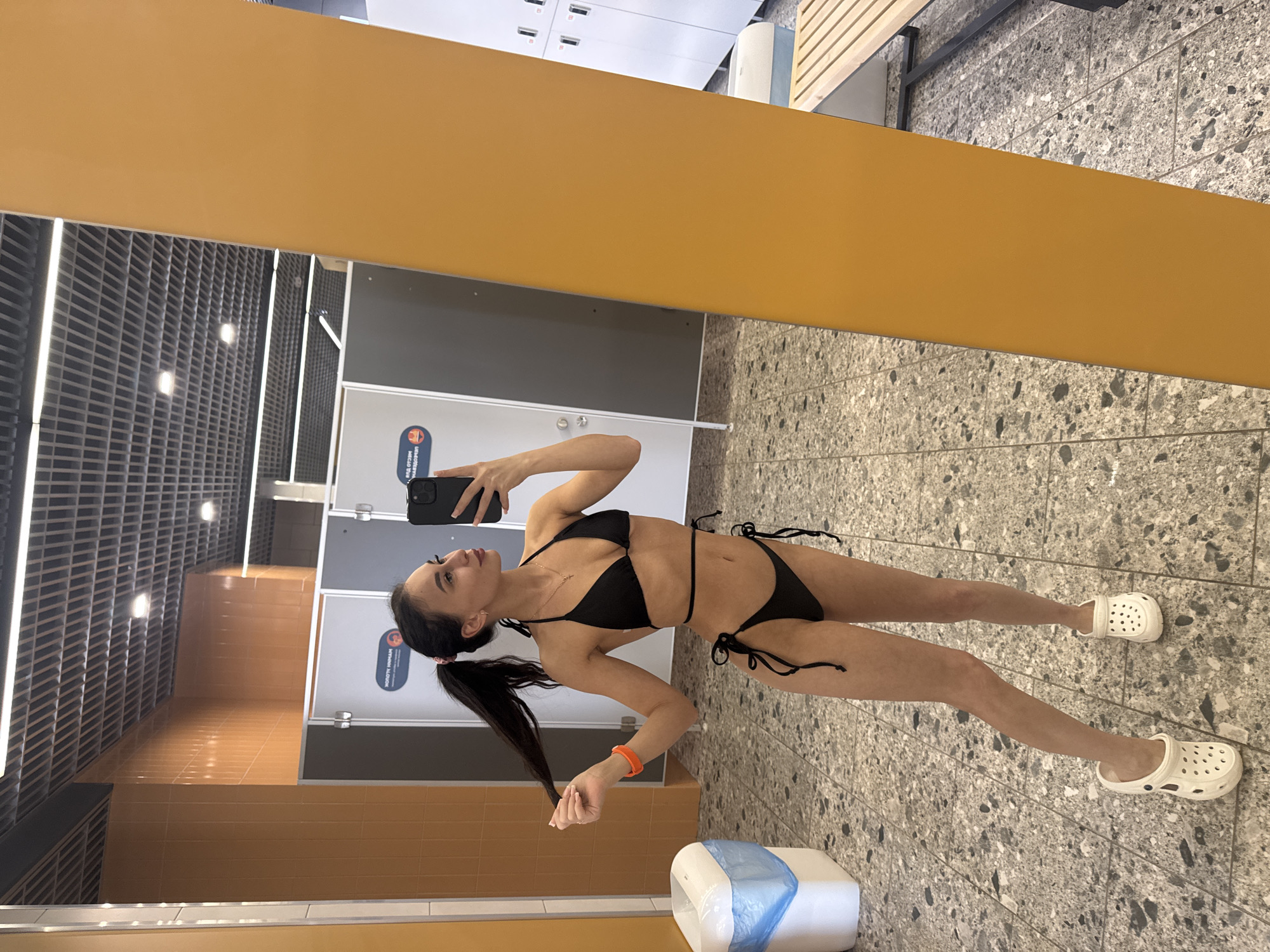 A young woman is taking a selfie in what appears to be a locker room or changing area. She is wearing a black bikini and white Crocs-style shoes. Her hair is pulled back in a ponytail. She is holding a black smartphone in her right hand, presumably to take the photo. The location has tiled floors, locker room-style lockers, and restroom stalls visible in the background. There is also a trash receptacle with a blue plastic bag liner near her feet. Based on the appearance of the locker room, it's likely within a public facility like a gym, swimming pool, or sports complex. The city of Votkinsk, Russia, cannot be confirmed based solely on the image.