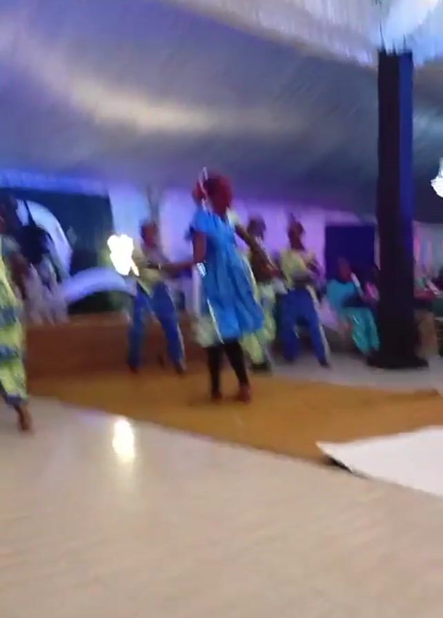 Five dancers in blue and yellow outfits perform on a brown carpet inside a tent-like structure. The floor is tiled and the tent is lit with blue lights. There are tables and people in the background.