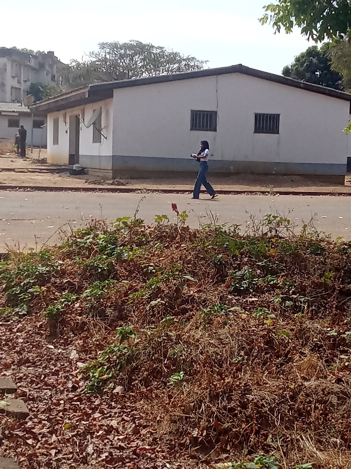 A woman walks along a road in front of a long, low white building with bars on two windows. Another figure stands near a similar building in the background. A larger building is visible further back. In the foreground, there is a large mound of dried leaves and vegetation.