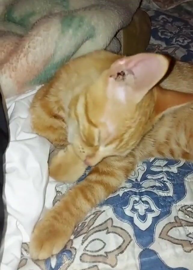 - "n orange tabby cat lying on a bed with a blue and white patterned comforter" by FM-pNPMj1, licensed under CC BY 4.0