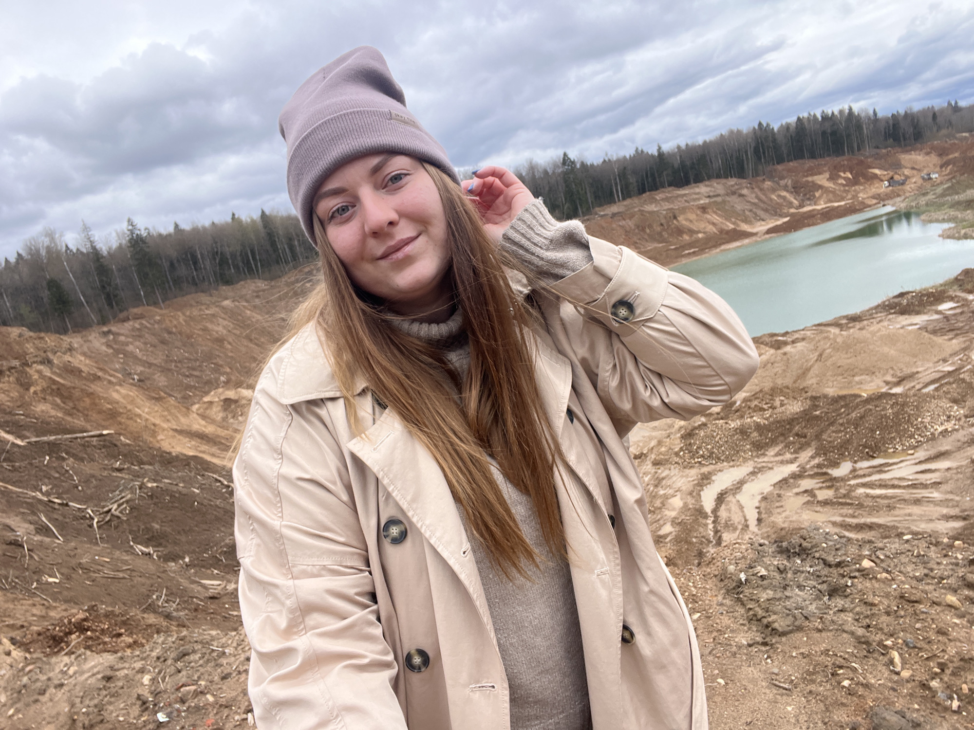 A woman stands in the foreground, wearing a beige trench coat and a mauve beanie. She has long brown hair and is smiling slightly. The background shows a large excavated area with a lake at the back. The terrain is mostly brown earth. Trees are visible along the periphery of the excavated area. The sky is overcast with dark clouds. The location is Ivlevo, Russia.