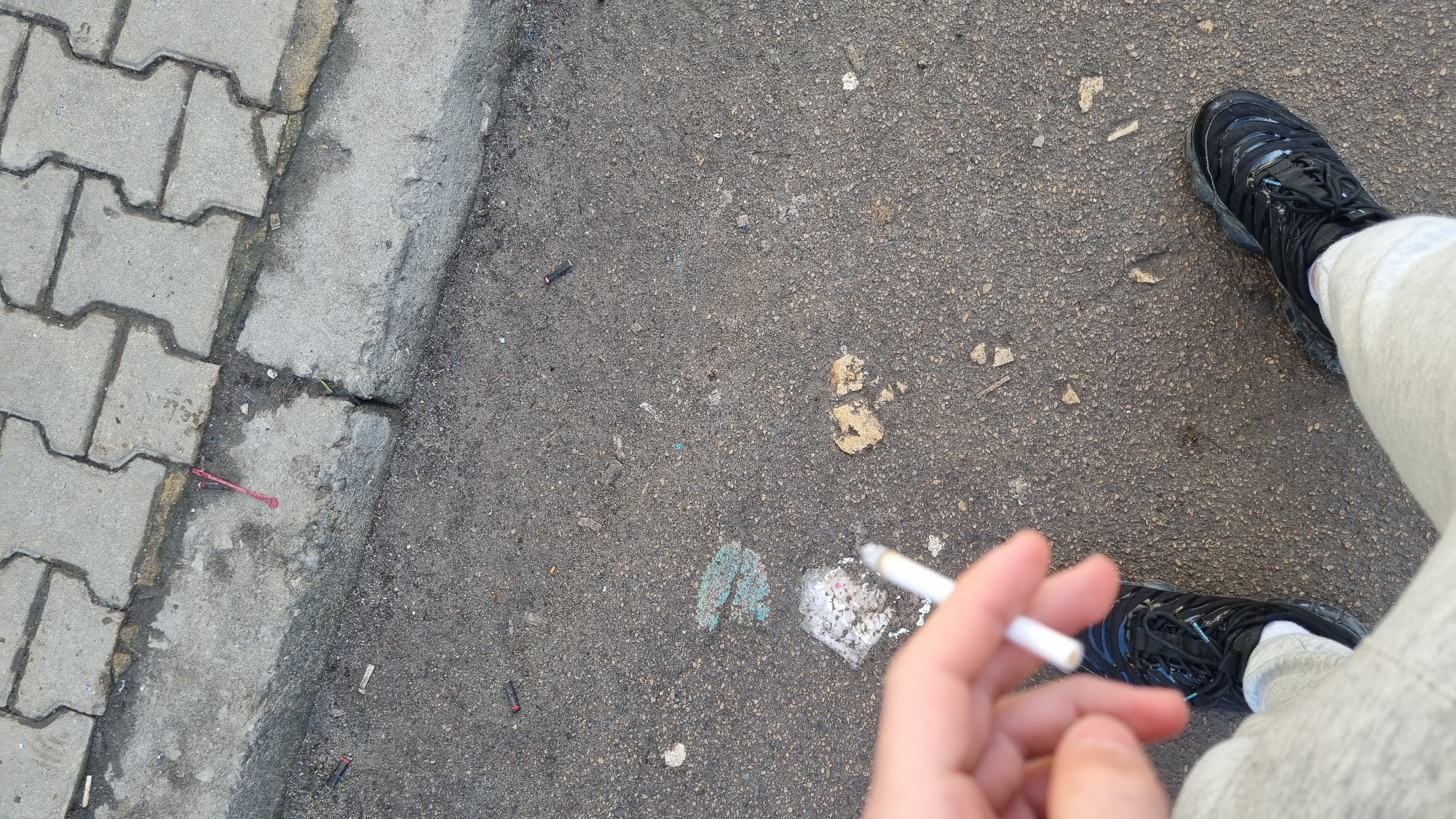 The scene depicts a first-person, downward-angle view of an individual standing on an asphalt surface next to a concrete curb and a sidewalk paved with grey interlocking blocks in Dolni Chiflik, Bulgaria. The individual's left hand is visible in the lower-left quadrant, holding a lit white-filtered cigarette between the index and middle fingers. The lower portions of the individual's legs and feet are visible, clad in light grey sweatpants, white socks, and black athletic shoes, identifiable as Nike Air Max Plus, with visible air units and lacing. The ground surface is dark grey asphalt, heavily textured with small gravel, dirt, and scattered debris. Immediately in front of the individual's feet, several items are present: * Multiple spent cigarette filters, some dark red and black, are scattered across the asphalt. * A distinctive patch of light blue-green residue, possibly dried paint or a spill, is visible on the asphalt. * Adjacent to the blue-green patch is a crumpled piece of white material, possibly paper or plastic. * Further right, two irregular, light brown patches, possibly dried mud or organic matter, are on the asphalt. * Near the concrete curb, a slender, bent red plastic object or string is visible. The concrete curb, separating the asphalt from the sidewalk, shows cracks and wear. The sidewalk consists of tightly fitted, light grey, hourglass-shaped concrete paver blocks, with some visible water stains or dampness along the edges and grout lines. The overall environment suggests an urban or semi-urban setting, characterized by pedestrian infrastructure and accumulated street litter.