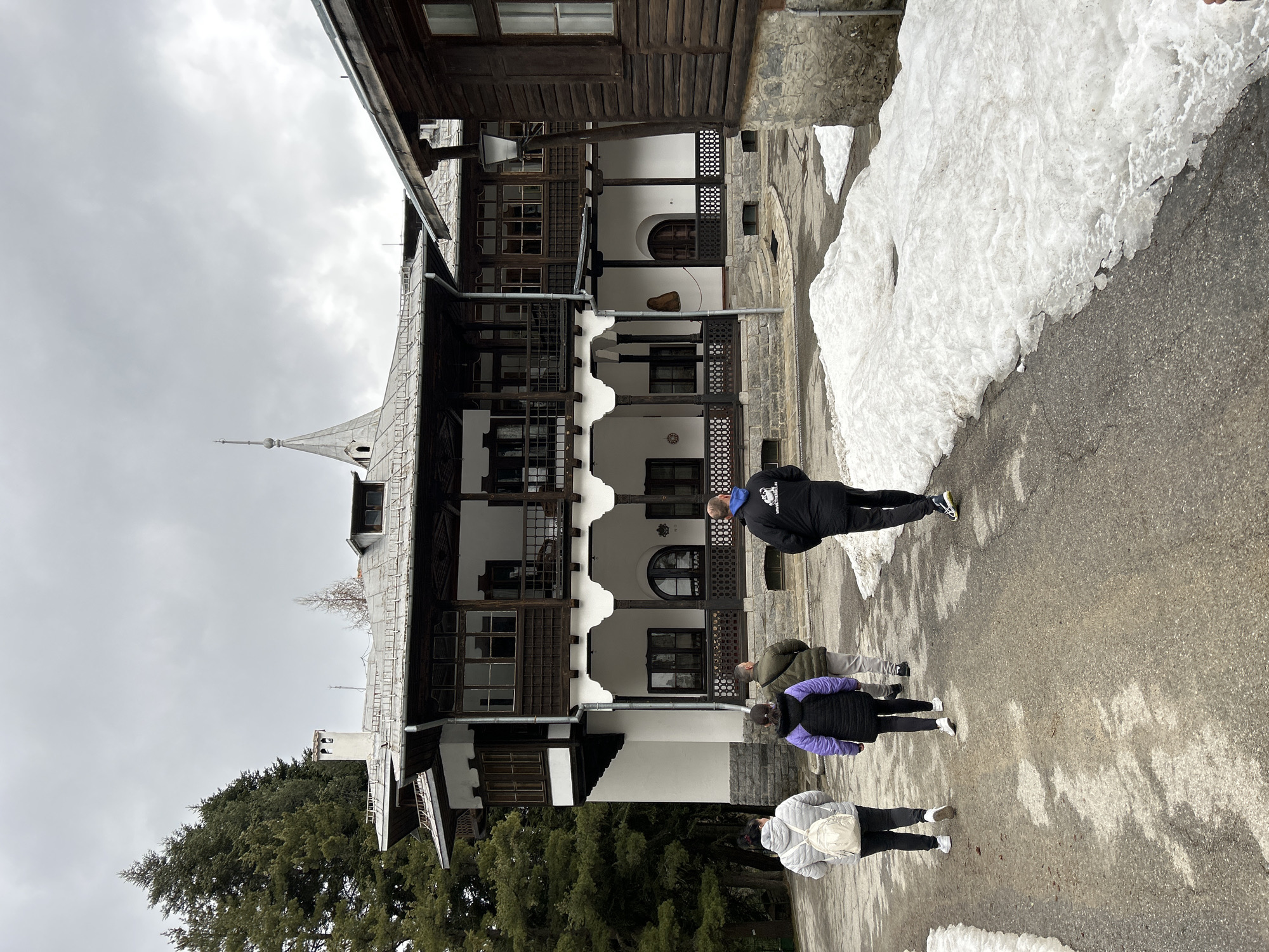The image depicts a large building, likely a historic structure, with a combination of wood and stone construction. It has multiple levels, with balconies featuring intricate woodwork details. In front of the building, a paved walkway is visible, partially covered with snow. Four individuals are walking along the walkway, away from the camera. The sky is overcast, suggesting a cloudy day. The location is the Royal Hunting Residence of Bistritsa in Samokov, Bulgaria.