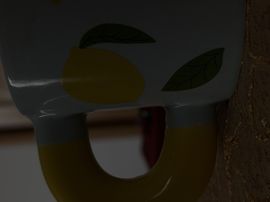 The scene is an interior, located in Griboyedov, Armenia. A white ceramic mug with a prominent yellow, C-shaped handle occupies the majority of the frame, positioned on a textured, light brown or golden surface. The mug's exterior features yellow lemon designs accompanied by dark green leaves. Illumination is dim, casting the mug and environment in low light, with subtle reflections visible on the mug's glossy surface. Through the mug's handle, a blurred, dark background is visible, containing indistinct shapes suggestive of indoor furniture or structures, including a faint reddish object. No individuals are present, and no actions or interactions are depicted.