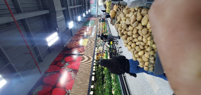 The image displays the interior of a supermarket produce section in Barquisimeto, Venezuela