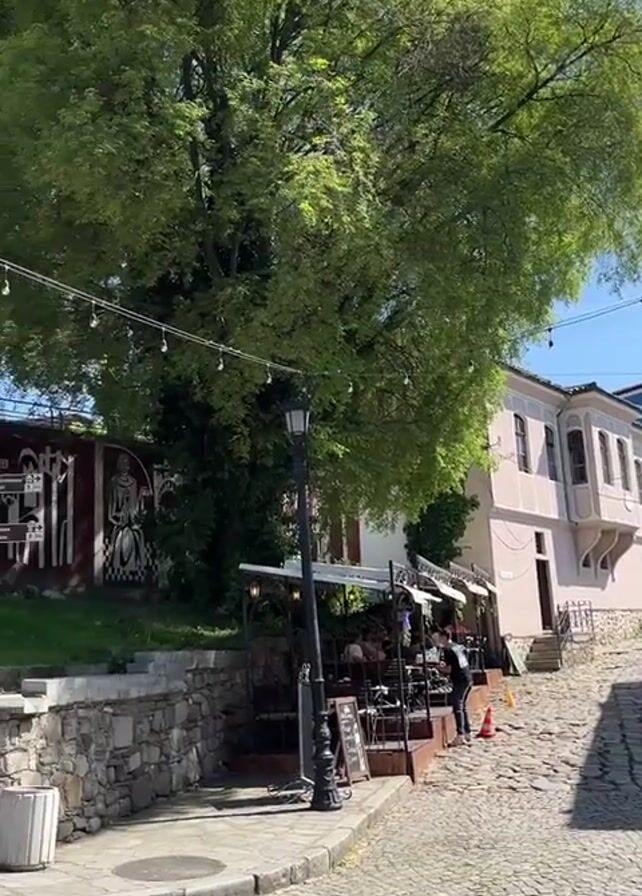 cobblestone street scene. The street slopes upward. A large green tree is on the left of the frame, partially obscuring a restaurant with people seated at tables. A pale pink building with a balcony is to the right. Above a stone wall on the left, there is a mural, and a large white building. Stairs lead upward on the right side of the frame. There are streetlights along the street. The sky is blue.
