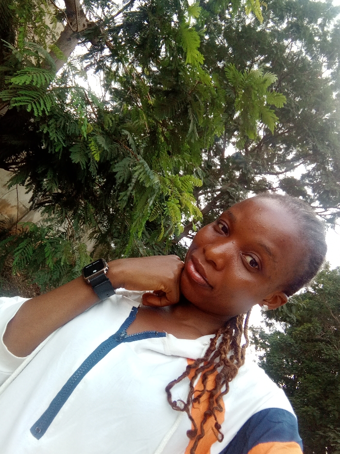 A medium close-up, vertical photograph depicts an individual, appearing female, posing outdoors. The subject has dark skin, short dark hair, and several orange-brown dreadlocks visible over the left shoulder (viewer's right). They are wearing a white hooded top with a prominent dark blue zipper running down the center front. A horizontal orange and dark blue stripe pattern is visible on the left side of the top (viewer's right). A black digital wristwatch with a dark screen is worn on the right wrist (viewer's left). The subject's right hand (viewer's left) is positioned with fingers curled, resting under the chin. A small, light-colored stud earring is present in the left earlobe (viewer's right). The subject looks directly at the camera with a slight smile and glossy lips. The background consists predominantly of dense green foliage from multiple trees, indicating an outdoor setting. Portions of a bright, possibly overcast sky are visible through the leaves. A light-colored wall or structure is partially visible on the far left side of the frame, behind some foliage. The specific location within Nsukka, Nigeria, cannot be determined from the visual information provided.