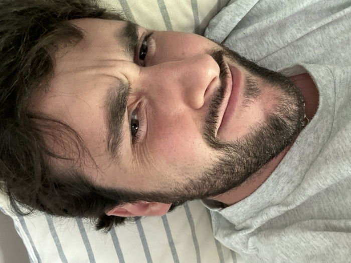The image depicts an adult male in an indoor setting within Lo Barnechea, Chile. The subject is lying on his right side, with his head resting on a pillow characterized by alternating light blue and white stripes. He is dressed in a light grey short-sleeved garment. The man possesses dark brown, wavy hair and a dark beard and mustache. His eyes are partially open, and a subtle upward curve is discernible at the corners of his mouth. A small, dark metallic ring, consistent with a lip piercing, is present at the right corner of his mouth. The ambient lighting appears soft and uniform. The visible environment is limited to the subject, his clothing, and the striped bedding.