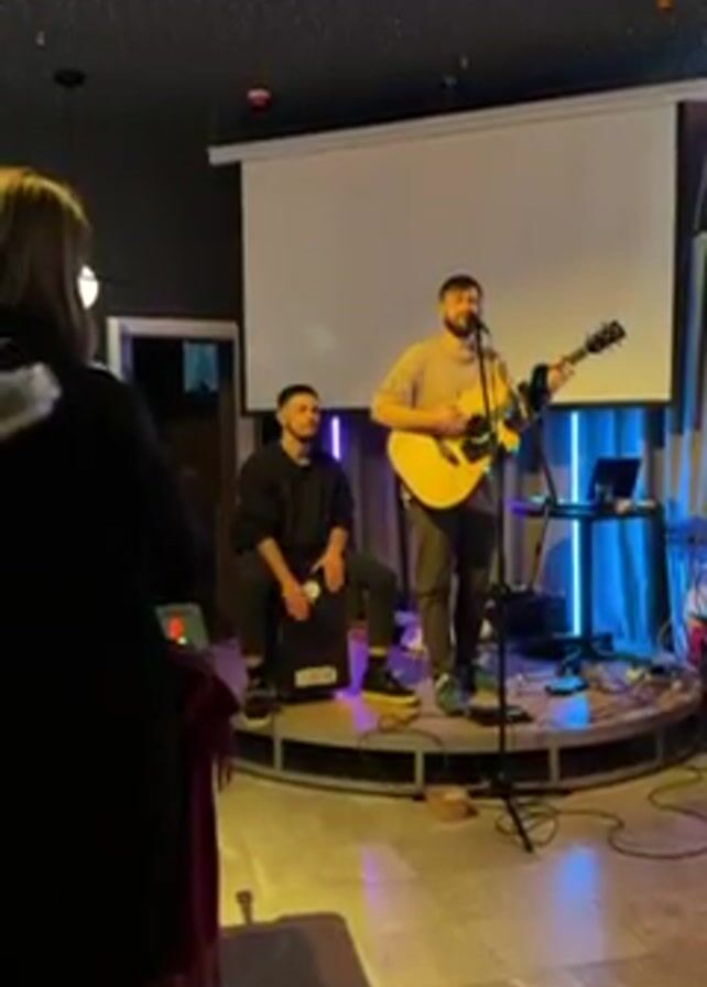 live musical performance in what appears to be a small venue or restaurant. There are two male musicians on a round, slightly elevated stage. One is playing an acoustic guitar and singing into a microphone. He is dressed in a beige top and dark pants. The other is seated playing a percussion instrument, possibly a cajon. He is wearing a dark top and dark pants. Behind them is a white projector screen. A table with a laptop and other equipment is visible to the right of the musicians, lit with blue lights. In the foreground, a woman is partially visible, appearing to be watching the performance and possibly recording with a phone. The venue has a dark ceiling with small reflective decorations. The floor has a light-colored patterned surface.